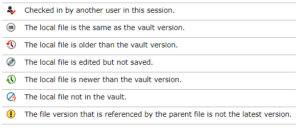 Vi kan se under Version Number två siffror ”1/2” där den första siffran är den lokala versionen, medans den andra siffran är versionen som finns i valvet ”1/2” betyder alltså att vi har en äldre version lokalt än vad som finns i valvet. Det är även då vi ser den röda klockan som indikerar just detta. Hade det varit tvärtom -/2 alltså att vi har en nyare version lokalt (som vi inte checkat in än) visas den gröna klockan.