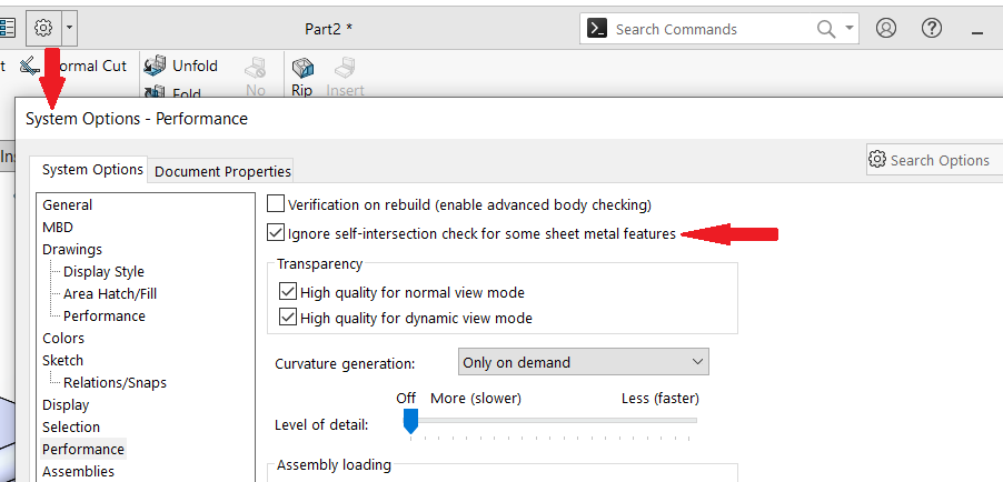 Inställningen för detta hittar vi i Tools > Options > System Options > Performance och om man bockar i ”Ignore self-intersection check for some sheet metal features” och sedan klickar på OK. Och därefter gör en Force Rebuild genom att trycka Ctrl+Q på tangentbordet så försvinner varningen.