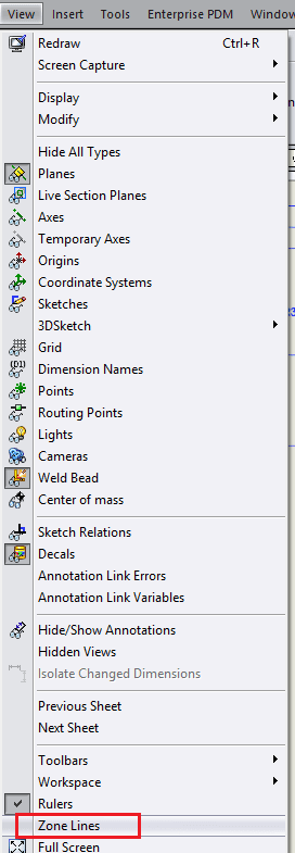 En av nyheterna i SOLIDWORKS 2015 är införandet av Drawing sheet zones på ett Sheet format. Med hjälp av dessa kan man definera vart placeringen av, t.ex. vyer, annoteringar, snittvyer m.m., är på ritningen, t.ex. D5, utöver detta så får man också veta på vilket blad den finns. För att visa dessa klickar man på View i menyraden och sedan på Zone Lines, då visas zonerna på ritningen.