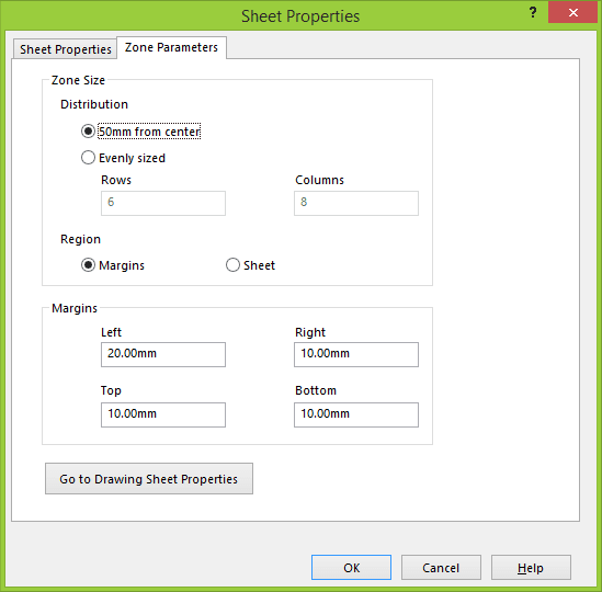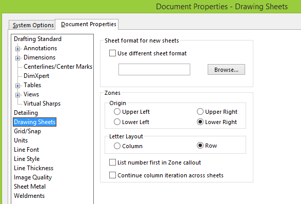 Vill man ändra från vilket håll bokstäverna och siffrorna ska börja, så klickar man på knappen ”Go to Drawing Sheet Properties”, alternativt går man via Tools > Options > Document Properties > Drawing Sheets.
