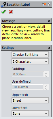 På ritningen kan man lägga till Location labels för att ”koppla ihop” två vyer. Location Labels kan man placera på detalj-, snitt- eller hjälpprojiceradevyer (Auxiliary). För att göra detta klickar man på menyn Insert > Annotations > Location Label. Klicka sedan antingen på detalj-, snitt-, hjälpvyn, snittlinje, detaljcirkel eller vypil för placera den första och sedan på vyn som hör till den.