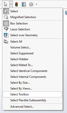 Ett starkt användningsområde för Selection Sets är i sammanställningar där vi kan kombinera denna funktionalitet med Advanced Selections. Advanced Selections hittar vi genom att klicka på pilen bredvid muspekarikonen. Här finns det alternativ som Select By Size, Select Identical Component och så vidare. Ett vanligt sätt att öka prestandan för en långsam sammanställning brukar vara att man suppressar alla toolboxkomponenter, och detta kan vi lätt göra genom att välja alternativet Select Toolbox.
