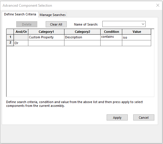 Sen finns det ytterligare ett val och det är advanced search där kan vi till exempel söka efter custom properties description som börjar på iso, för att markera alla standardkomponenter.