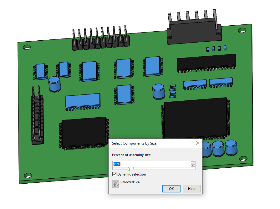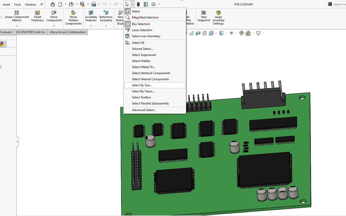 Vi börjar med ett klassiskt problem, vi har fått ett kretskort från leverantören. Ett väldigt fint sådant, med dilemmat att det består av väldigt många komponenter. Dessa komponenter behövs oftast inte för att din sammanställning ska se bra ut utan bara slöar ner modellen. In kommer select by size. Detta verktyg kan välja modeller utifrån en procentsats av hela sammanställningen. Så det vi behöver göra för att få en mycket snabbare modell att jobba med är att skapa en derived configuration. Sen väljer vi ut de komponenterna vi inte vill se och tar suppress på dessa. Då får vi en möjlighet att bara välja lättviktskonfiguration. Sedan kan vi, när vi ska skapa en bild till kunden, hoppa tillbaka till den fulla konfigurationen och se allt igen.