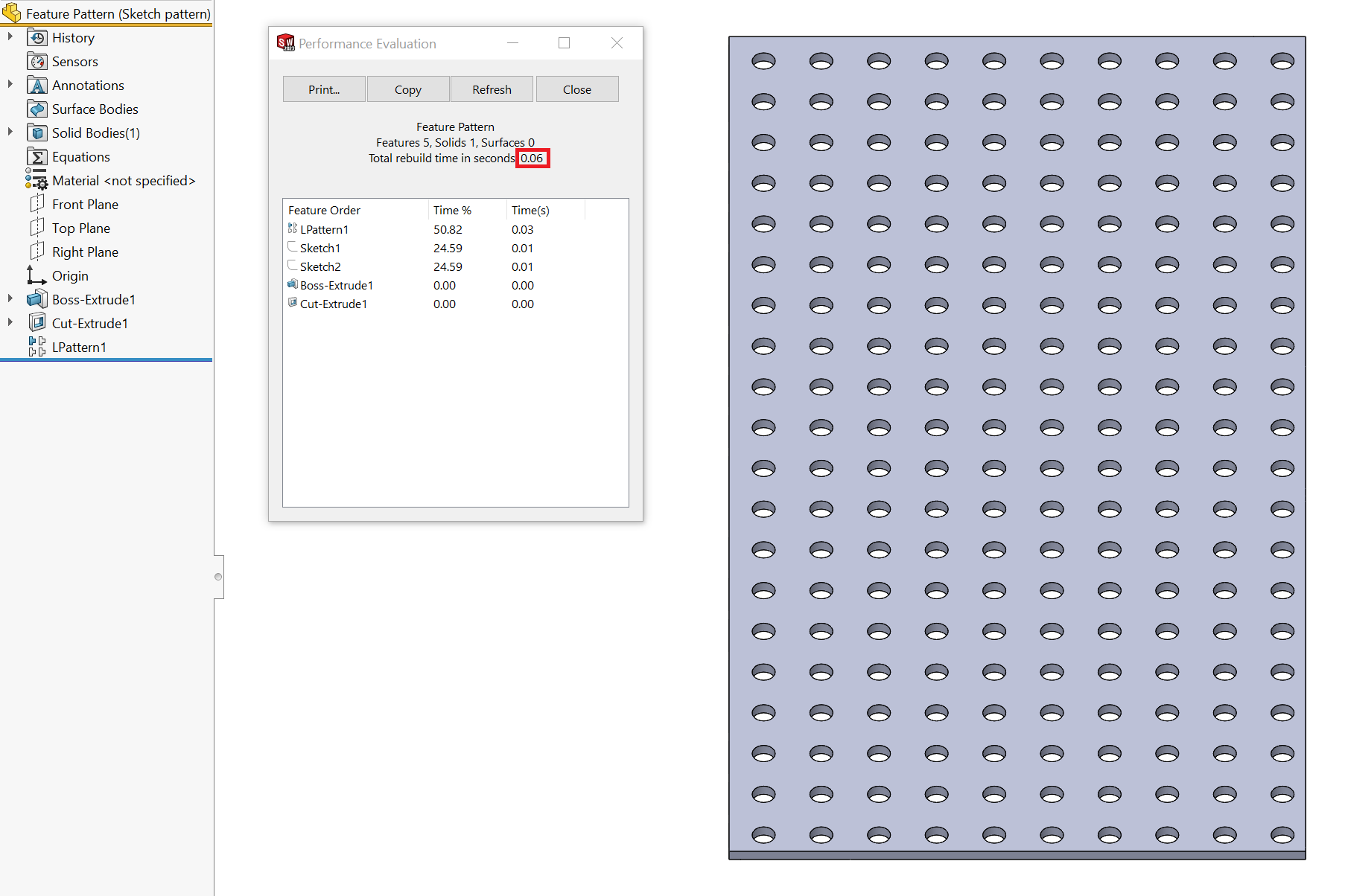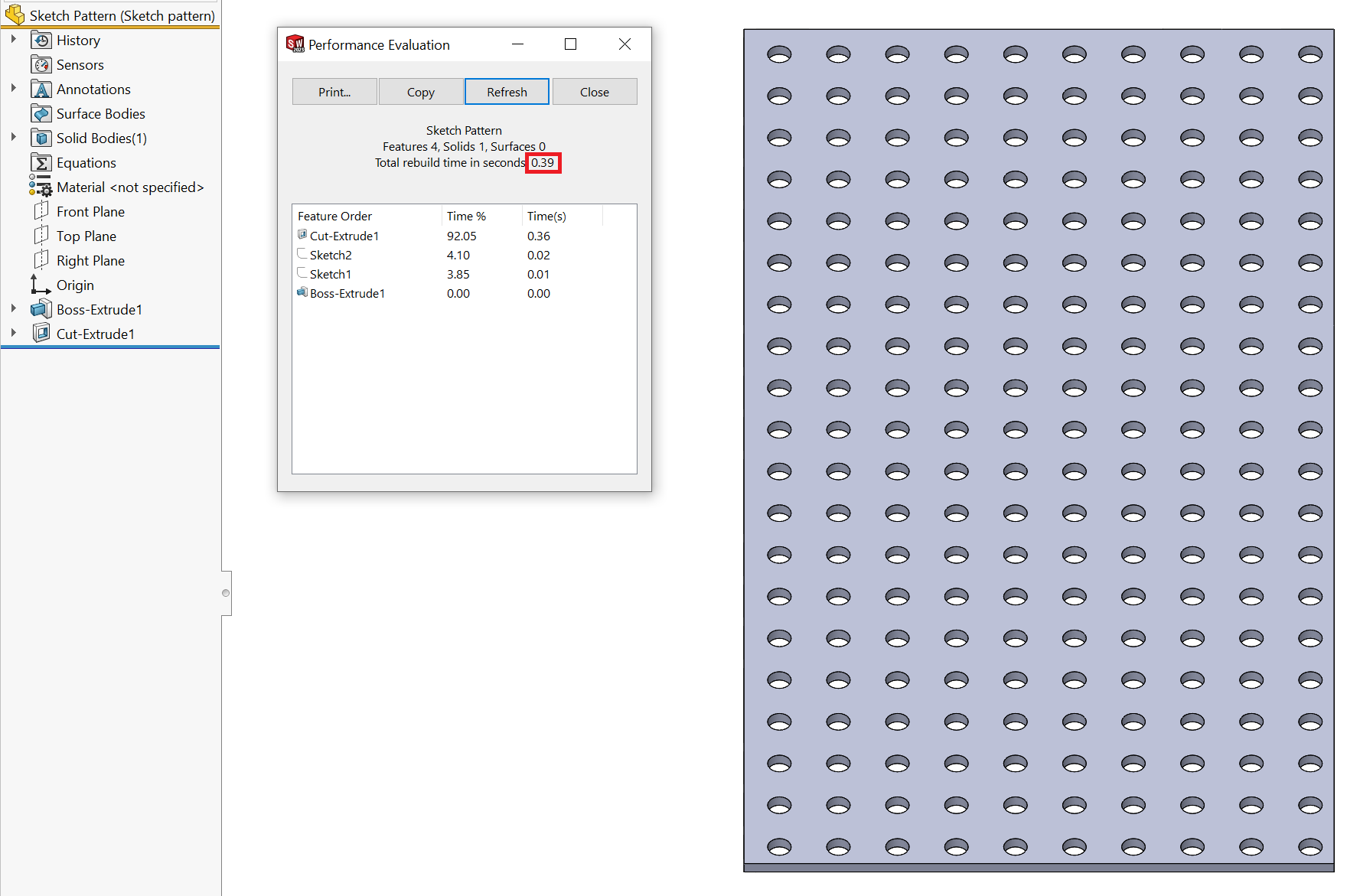 Å andra sidan, om vi skapar en liknande modell genom att först skapa det första hålet med en cut extrude och sedan använder det som grund för en linear pattern, minskar återuppbyggnadstiden avsevärt till 0.06 sekunder.
