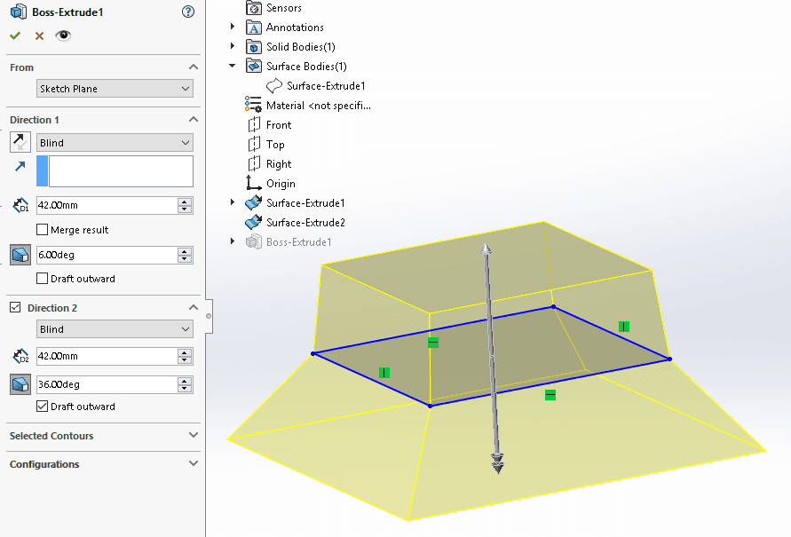 Släppningsvinklar påverkar stora delar av modellen och en generell rekommendation är att införa vinklarna så tidigt dom möjligt. Om man gör som med avrundningar, väntar till sent i modellhistorien får man i allmänhet fler oönskade situationer. Operationen som man kanske först tänker på är den som heter just draft. Draft lägger till släppningsvinklar, låter ju lämpligt. Innan ni kan använda kommandot draft, behöver ni någon yta att drafta, kanske från en extruderingsoperation.