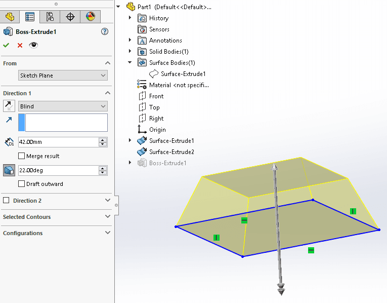 Men kolla här då, ni kan extrudera en 3D-skiss, jodå, om ni bara ser till att ha en extrutionsriktning till hands i form av ett streck/kant eller ett plan. En 3D-skiss erbjuder många möjligheter och kan kanske vara ett ämne för diskussion längre fram.