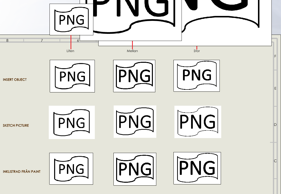 Med en bild kopierad från Paint går det tyvärr inte att se transparensen inne i SOLIDWORKS, men när ritningen sparas ut som PDF, eDrawings mm så fungerar transparens. - På andra plats kommer metoden Sketch picture för hantering av transparenta bilder. Sketch picture behöver inte heller Paint för att fungera men något lägre upplösning i PDF och utskrift (se bild ovan).