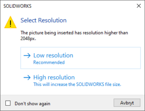 - Bilder sparas utan kompression i SOLIDWORKS, därför är det bäst om PNG/JPG-filen har en filstorlek mellan 40-150 kb.