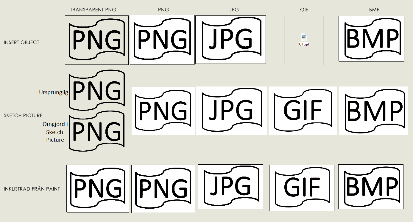 - I vårt test ingår tre olika metoder att ta in loggan med: ”Insert Object”, ”Sketch Picture” och ”Copy & Paste från Microsoft Paint”.