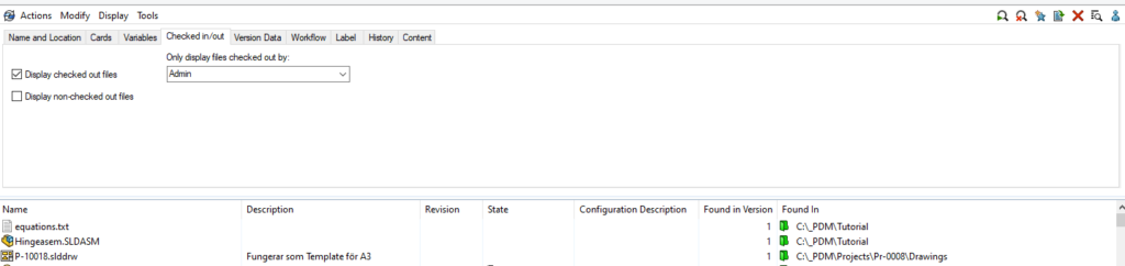 Perfekt för att i slutet av dagen se om man har glömt checka in några filer i valvet. Då bockar man ur ”Dispaly non checked out files” och väljer sin användare i dropdown menyn.