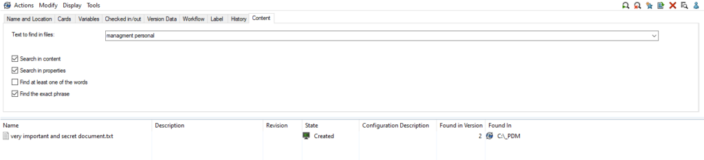 Här söker verktyget efter innehåll och properties i filer som finns i valvet. Just denna funktion fungerar bara med vissa filer så som office filer, textfiler och PDF:er.