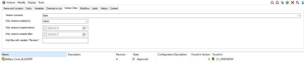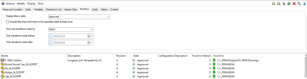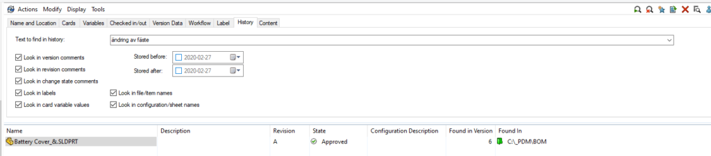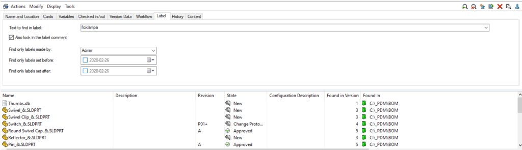 Om man använder sig av Labels för filer eller mappar så går det att söka på dem i den här fliken. (Endast för PDM Proffesional)