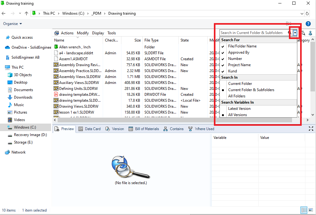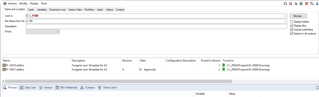 En av de viktigaste funktionerna i PDM är möjligheten till att kunna söka på filer och dess metadata. Detta kan man sätta upp på olika sätt men antingen genom den nya fukntionen som tillkom i år nämligen Quicksearch! Ett annat sätt att söka på är genom vårat uppsatta sökkort Complete search.