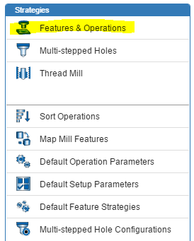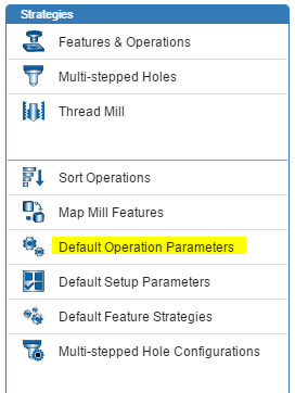 När du kommer in i menyn får du val möjligheten att justera operationsparameterna för varje operation, ex Rough mill, Drill. Dessa inställningar faller igenom på alla nya operation som skapas i en ny ”setup” som du skapar manuellt. Det vill säga om du genererar operationerna via ”Generate Operation plan” (dvs om du genererar operationerna automatiskt) så kommer inställningarna ifrån strategi och inte ifrån ”default operation parameters”. Dock blir det inte svårare än att bara då gå in på strategi och justera inställningar om det skulle önskas. Detta gör du under ”Features & Operations”, se bild tre.