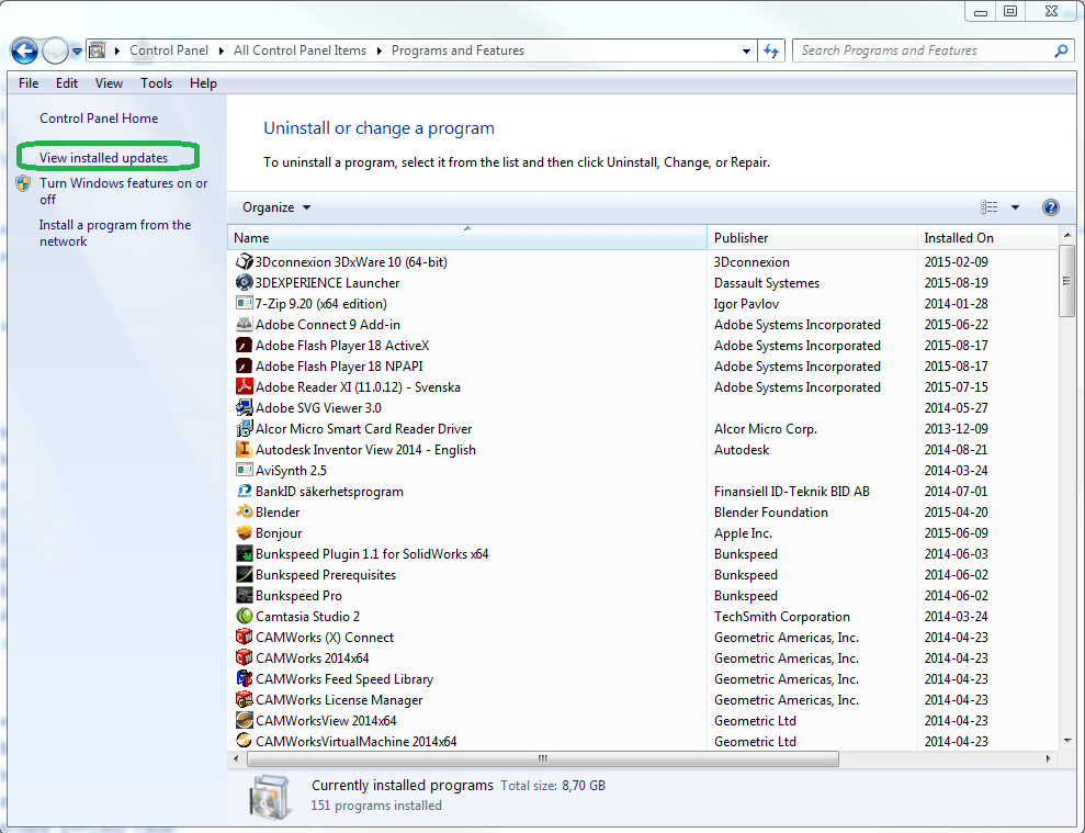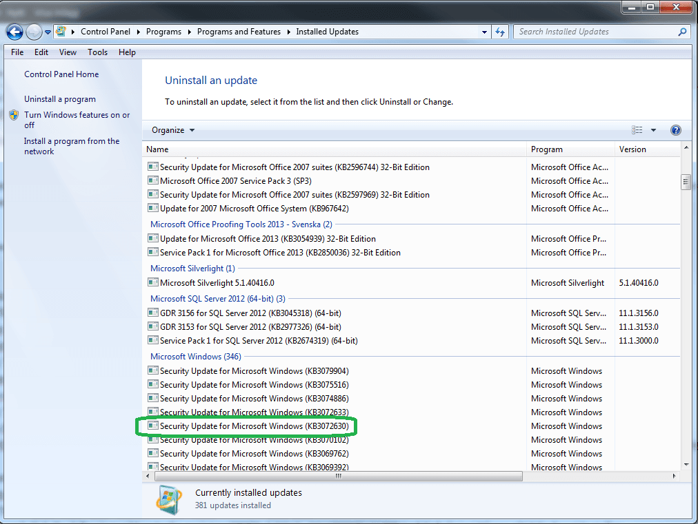 För att kontrollera om uppdatering finns på datorn går man till windows kontrollpanel och klickar sig fram till Program & funktioner (Programs & features). I kolumnen till vänster kan man sedan be om att få se installerade säkerhetsuppdateringar. Den vi letar efter heter KB3072630.