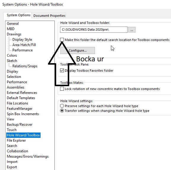 Jag ska nämna en till sak. Dessa toolbox parter är fortfarande massa intelligence i sig att den är en toolbox komponent. Vi har egentligen bara sparat ut kopior som ser ut som parter. Jag skulle också råda att bocka ur denna inställning i solidworks om ni väljer att jobba med toolbox komponenter på detta sätt. Se bild nedan.