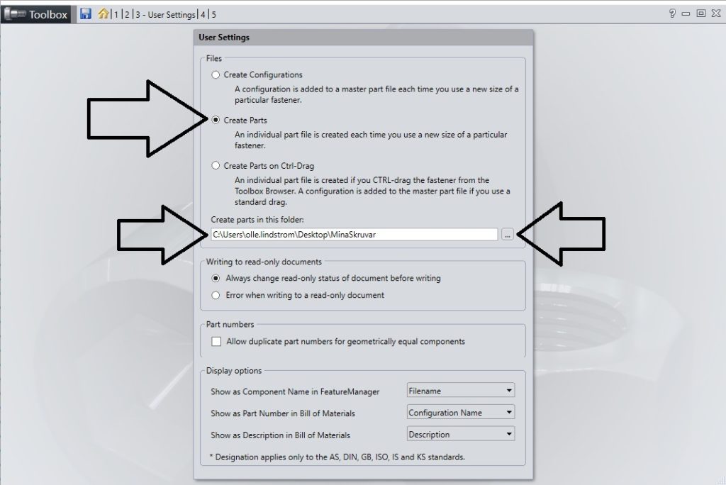 För att ändra att våra valda komponenter ska bli parter med olika storlekar, så går vi under alternativ ”3. Define user settings”. Där i hittar vi alternativet ” create parts” och klickar i. Samt så pekar vi ut en mapp där vi vill att våra delar ska hamna. OBS peka inte ut era befintliga toolbox mapp så ni råka skriva över något utav misstag. Välj en ny lämplig plats. Se bild nedan.