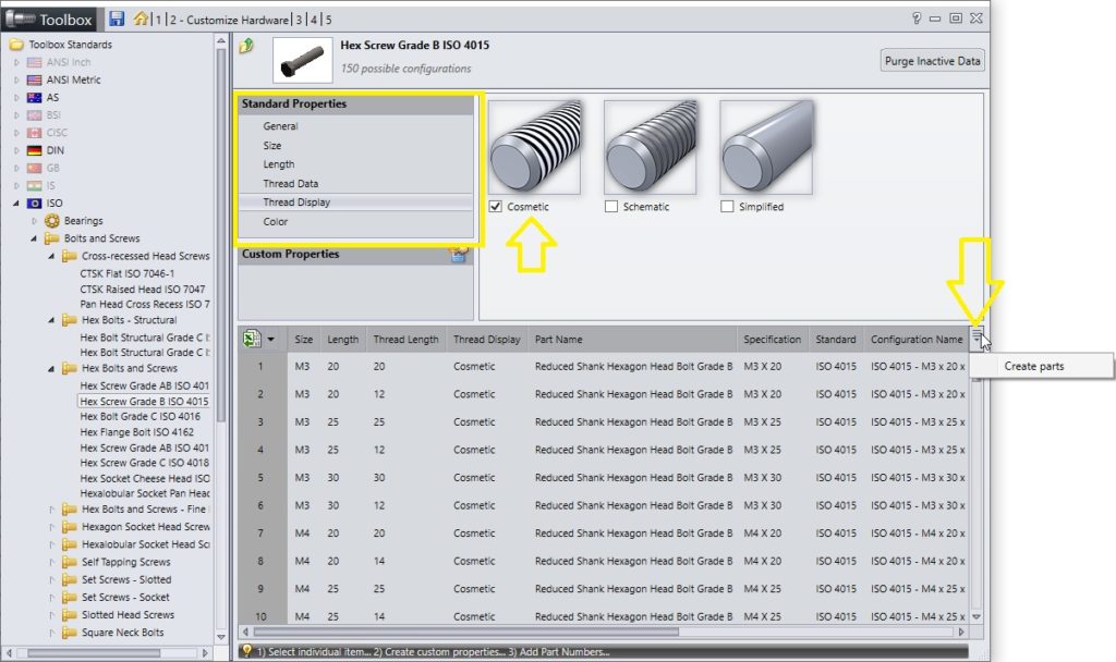 Efter att klickat mig ner till den skruv jag vill få ut alla storlekar utav så väljer jag att jag bara vill att toolboxen ska ha ”cosmetic” gänga, dvs ”thread display”. Då kommer bara skruvar med en bild utav gänga att skapas. Vilket är de dom flesta vill. Ni kan ändra vilka storlekar som ska finns också genom att konfigurera dom inställningarna som går att välja mellan i den gula boxen. Se bild nedan.