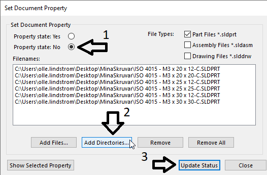 Och det ser ut så här. Följ stegen enligt bilden. 1 ska vara NO. 2 lägger du till vilken mapp där alla parter finns. 3 så kör du jobbet.