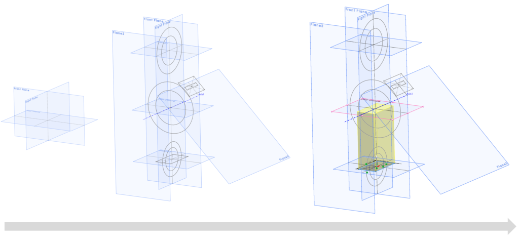 När du startar en ny modell finner du alltid tre grundplan (Front, Right och Top). Dessa har en fast position i rymden och är en bra grund att utgå ifrån. Genom att skapa parallella, vinklade eller mittplan kopplade till dessa tre grundplan kan man skapa en väldigt stabil modell. Det ger också goda möjligheter att enkelt göra förändringar. Här nedan följer ett exempel på hur vi kan utnyttja plan för att styra geometrin. Vi kan börja med att addera plan som t ex beskriver ytor för angränsande interface, avståndet mellan två geometrier eller plan för uppmätning av detaljen osv. Sedan skapar vi vår grundgeometri och använder oss av våra nya plan för att beskriva läge, riktning och storlek på vår geometri.
