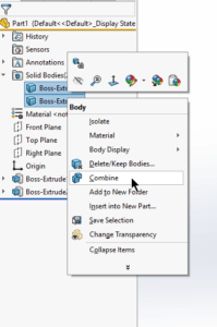 Markera soliderna > högerklick > välj Combine (eller Insert>Features>Combine).