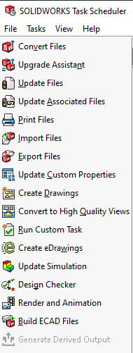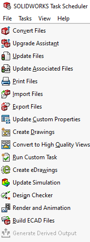SOLIDWORKS Task Scheduler är en mjukvara som följer med installationen av SOLIDWORKS. Den används för att batch-köra uppgifter på schemalagda tider. Syftet är att effektivisera tids- och prestandakrävande arbeten. Några exempel är; Uppdatera filer till en ny SOLIDWORKS-version, skapa pdf:er, skriva ut filer eller uppdatera filegenskaper. Vi kan även köra skräddarsydda macron eller kommandoradsargument som kan appliceras på vilket program du vill.