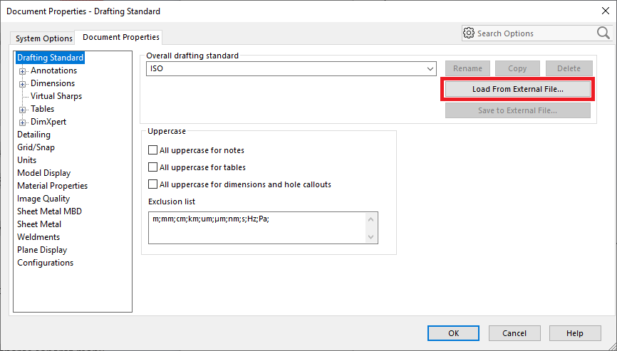 - Om filen skapats i en äldre version av SOLIDWORKS och går att redigera kan du spara ut er ritstandard som hör till nuvarande SOLIDWORKS-mall. Det gör du genom att skapa ett nytt dokument och i Options – Document Properties – Drafting Standard välja Save to external file.