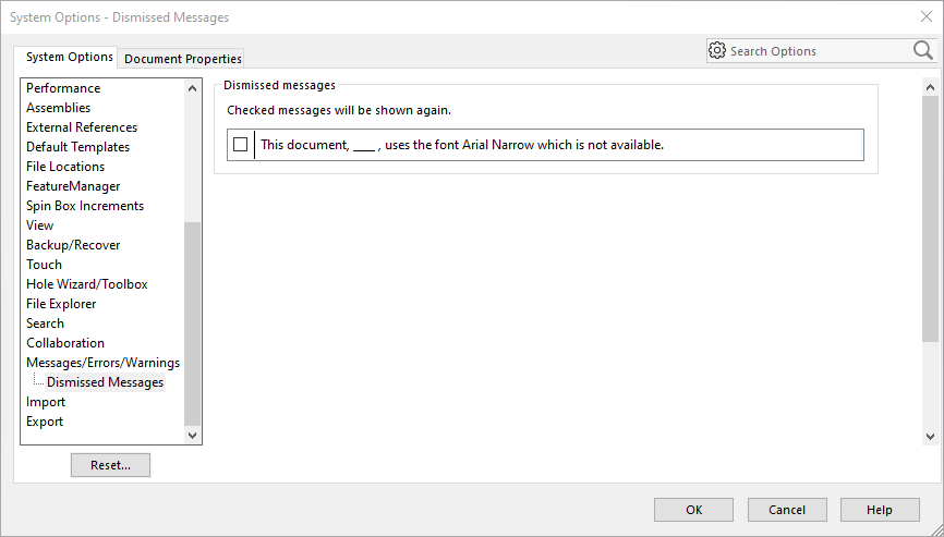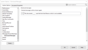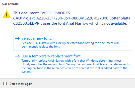 Allt som oftast får vi ett meddelande från SOLIDWORKS där något mer eller mindre viktigt beslut ska fattas och om det tillhör det senare möjligheten att välja ”Don’t show again” för. Men saknas den normala varianten av teckensnittet så ersätter SOLIDWORKS det automatiskt med kursiv eller fet variant utan något felmeddelande.