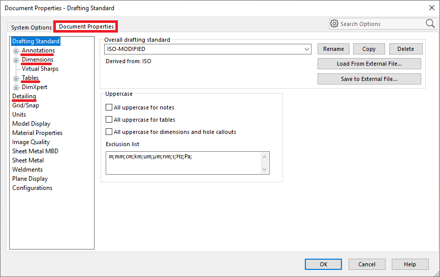 Det är inte ovanligt att frångå teckensnittet i dokumentinställningen när ”Sketch Text” eller ”Drawing Note” används. Dokumentinställningen för dessa finns i Options – Document Properties – Annotations.