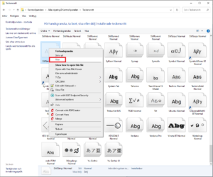 - Teckensnittet kan vara dolt i Windows kontrollpanel – Teckensnitt, det går att visa igen genom att högerklicka och välja ”Visa”.