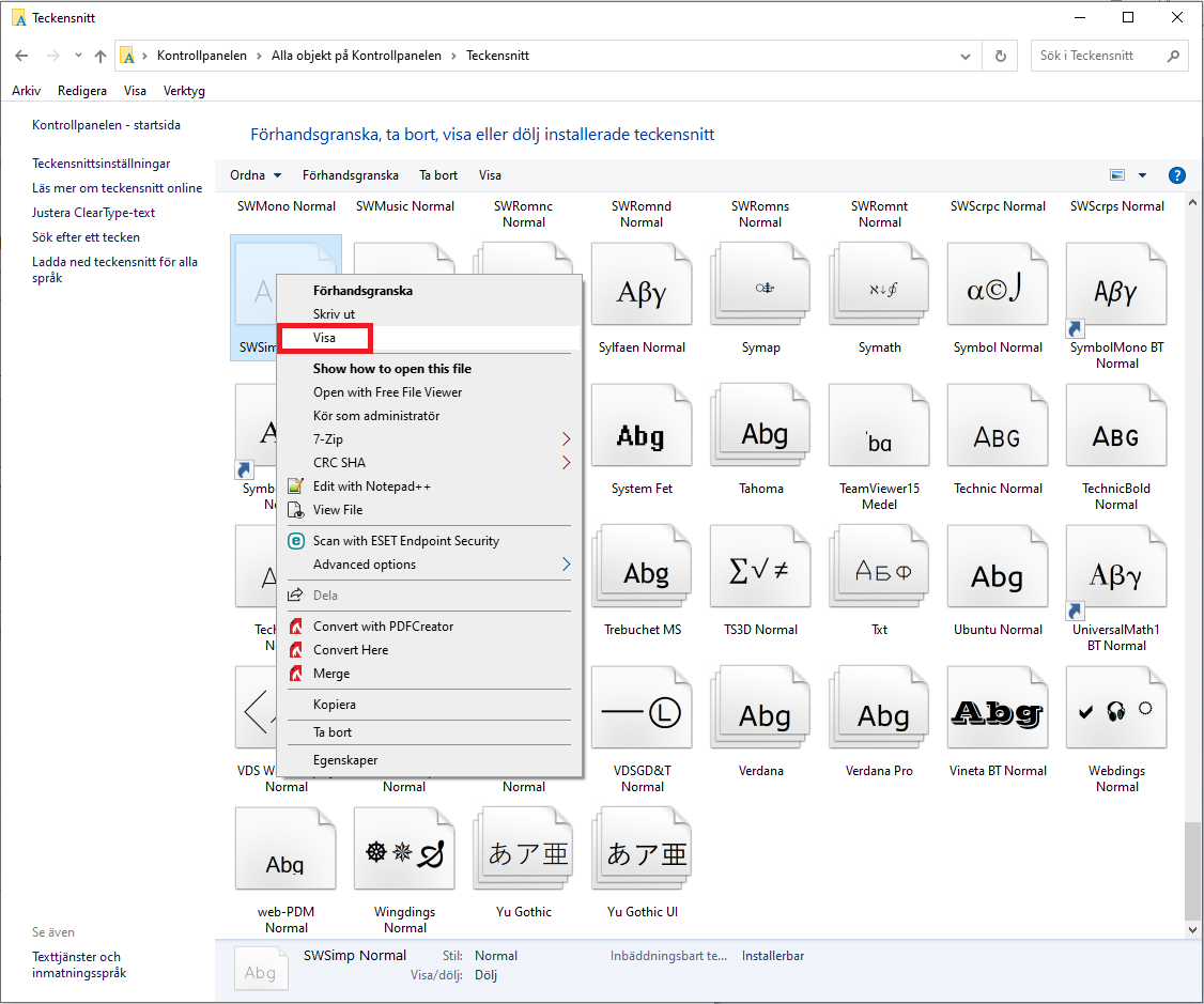 Windows kontrollpanel – Teckensnitt – Visa/Döj
