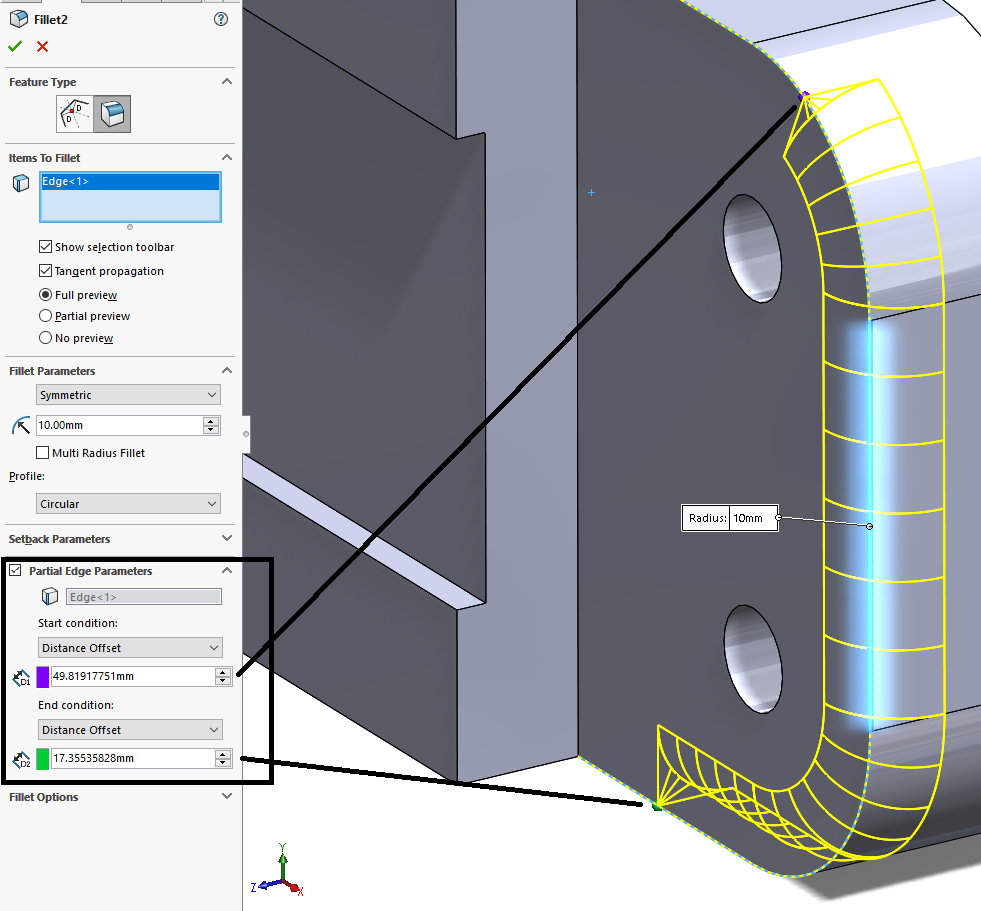 Funktionen heter ”Partial Edge Parameters” och finns lite längre ner i ”Property manager” till vänster när man använder ”Fillet”. Denna funktionalitet finns också för ”Chamfer”. Se bild nedan.