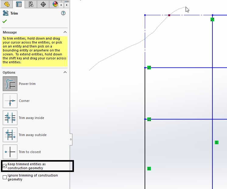 Konstruktionslinjer kan man sätta ut. Solidworks har nu även gjort det lite smidigare att man kan nu med ”Trim Entities” bock i ” keep trimmed entites as a construction geometry”. Vilket innebär att dom linjerna man kapar med trim-verktyget blir konstruktions linjer. Se bild nedan för vart denna inställning finns och exempel.