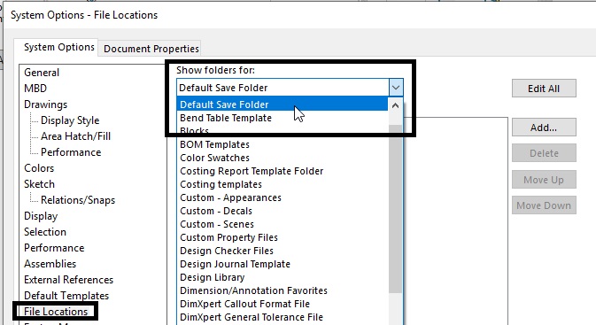 Min sista lilla gömda juvel är att man kan nu ställa in ”Default save location” i solidworks. Så när man trycker på ”save-as” poppar din utforskare upp på vald plats. Kan ju vara behagligt att spara en sekund på det.