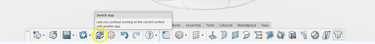 Låt oss säga att du modellerat upp en form i xShape och vill nu arbeta vidare med att skapa detaljer i xDesign. För att byta app, klicka då på Switch App i aktionmenyn och välj vilken applikation du vill att modellen ska öppnas upp i. I detta fall väljer vi xDesign.