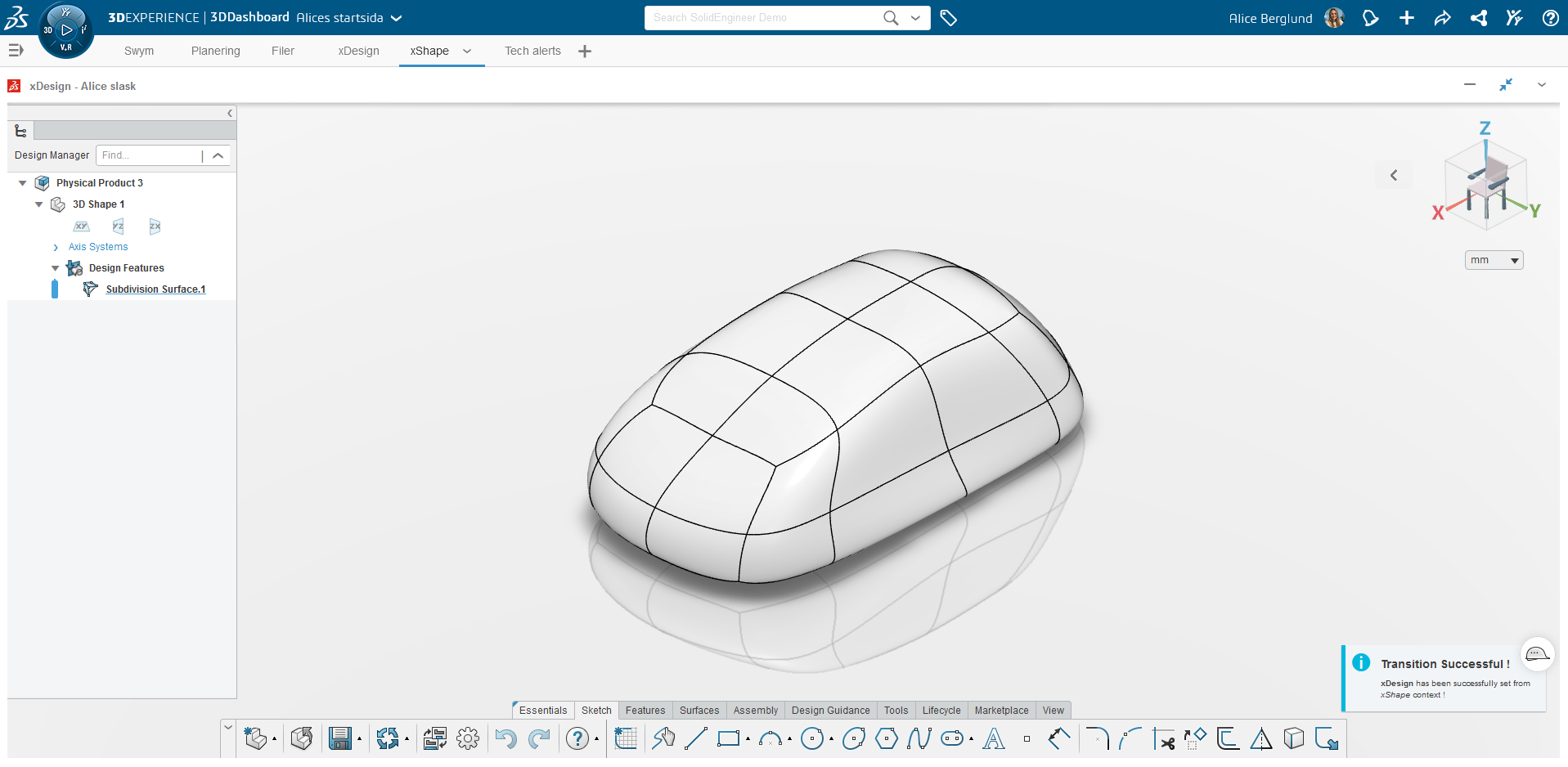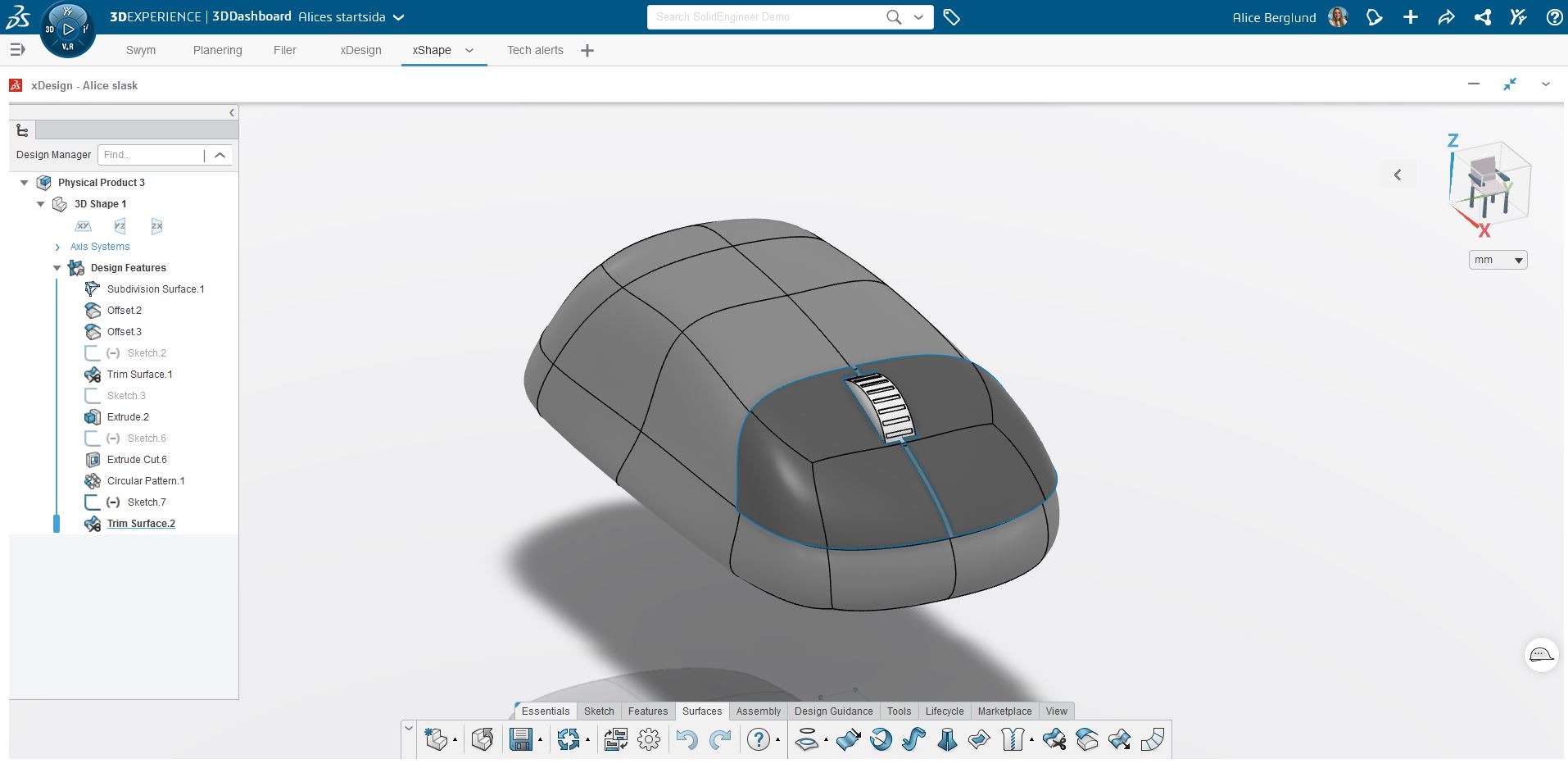 Med applikationerna xDesign och xShape har du möjlighet att designa och skapa 3D-modeller direkt i 3DEXPERIENCE Platform. Apparna liknar varandra i många fall, men erbjuder samtidigt två helt olika sätt att arbeta på. I xDesign ritar du upp modeller genom att att extrudera, svepa eller rotera en skiss. I xShape däremot arbetar du med organiska former på ett helt annat sätt. Att friformsmodellera på det sätt man gör i xShape är något som xDesign, eller SOLIDWORKS för den delen, inte erbjuder.