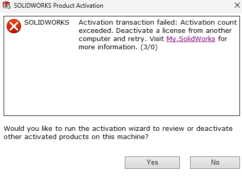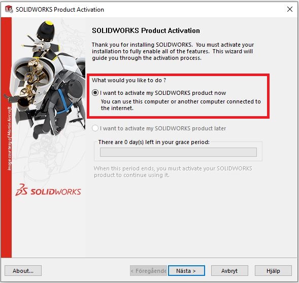 För att kunna använda SOLIDWORKS-produkter med fasta licenser, så måste de aktiveras på en dator. För att kunna flytta en licens från en dator till en annan, så behöver licensen deaktiveras på den gamla datorn och sedan aktiveras på den nya datorn. Detta eftersom fasta licenser endast kan vara aktiva på en dator i taget. Om en dator inte har en aktiv licens, så dyker en ruta upp när SOLIDWORKS startas. Där finns möjligheten att direkt aktivera licensen, se bild nedan.