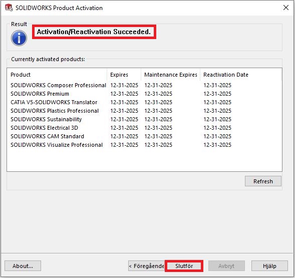 Om aktiveringen/deaktiveringen gick igenom så dyker en informationsruta upp med ett meddelande, samt en lista på aktiverade produkter. Tryck sedan på Slutför.