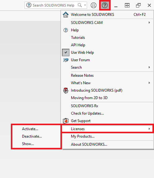 Inne i SOLIDWORKS finns det möjlighet att aktivera och deaktivera licenser, samt visa vilka produkter som är aktiva på datorn. Detta görs i SOLIDWORKS Product Activation, som hittas under frågetecknet och sen Licenses högst upp till höger, se bild nedan.