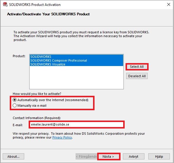 Aktivering och deaktivering görs på samma sätt inne i SOLIDWORKS Product Activation. Först får vi välja vilka licenser som ska aktiveras/deaktiveras. Sedan får vi välja vilken metod som ska användas. Rekommenderat är att välja alternativet Automatically over the internet, och då måste en mejladress fyllas i. Tryck sedan på Nästa, se bild nedan.