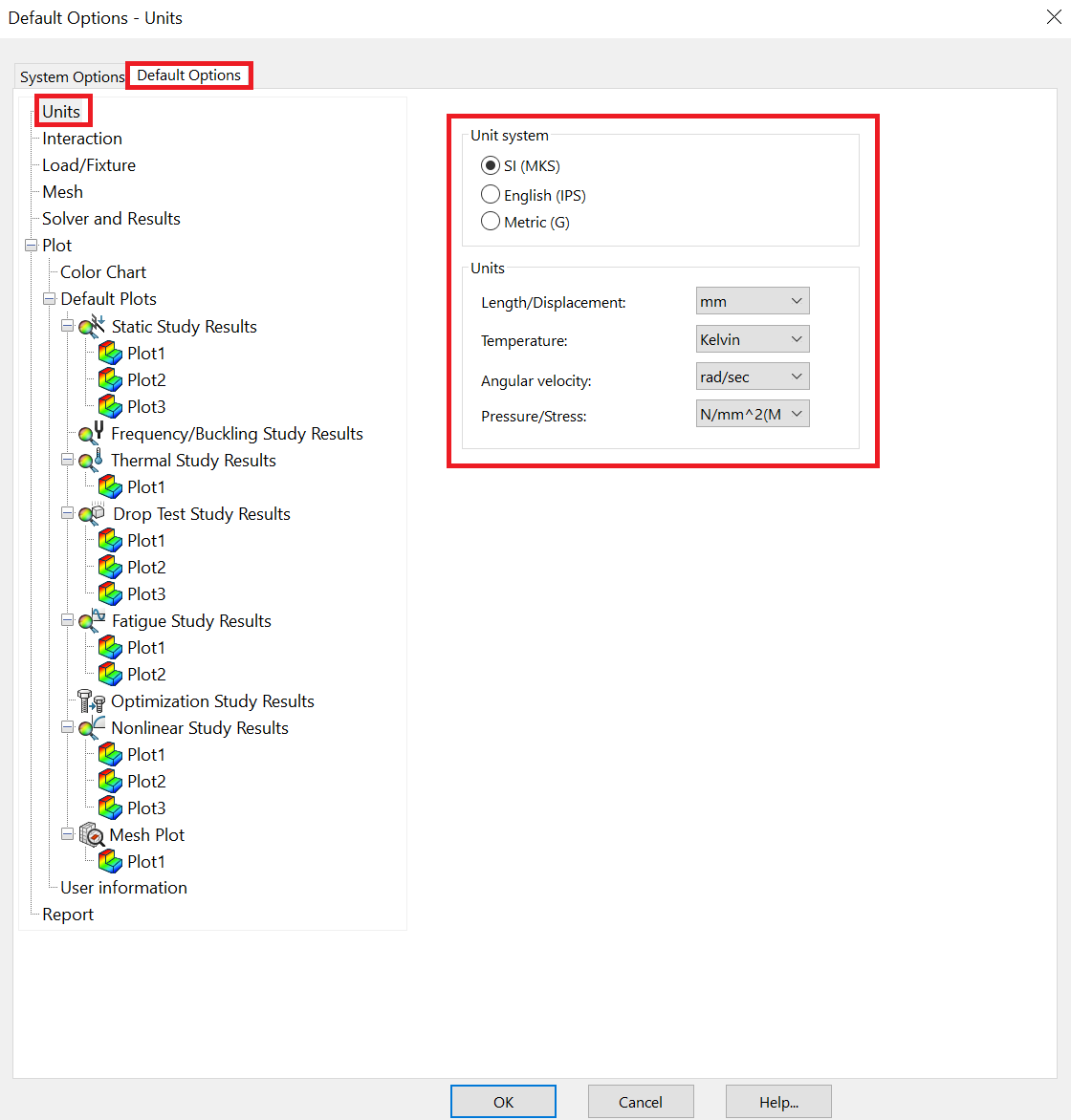 I SOLIDWORKS Simulation går det att ändra vilket enhetssystem som ska vara standard vid inmatning samt för resultat i en simulering. Det går också att specificera vilken enhet som ska användas för längd/förskjutning, temperatur, vinkelhastighet och tryck/spänning. Dessa enheter kommer användas som standard, men vill man någon gång ange en annan enhet går detta att justera i PropertyManager för varje enskilt kommando.