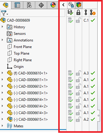 Ett annat sätt är att gå via 3DEXPERIENCE add-in:et i Task Pane. Där går det att högerklicka på en fil för att trycka på Lock eller Unlock, beroende på vilket läge filen befinner sig i. Är filen upplåst och fri att arbeta med så syns ett öppet hänglås i en av kolumnerna. Är filen låst av någon annan så dyker ett stängt hänglås upp, och om du själv har låst filen så ser du en grön nyckel som symbol.