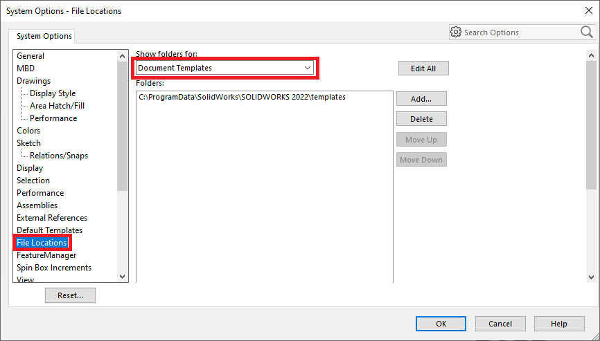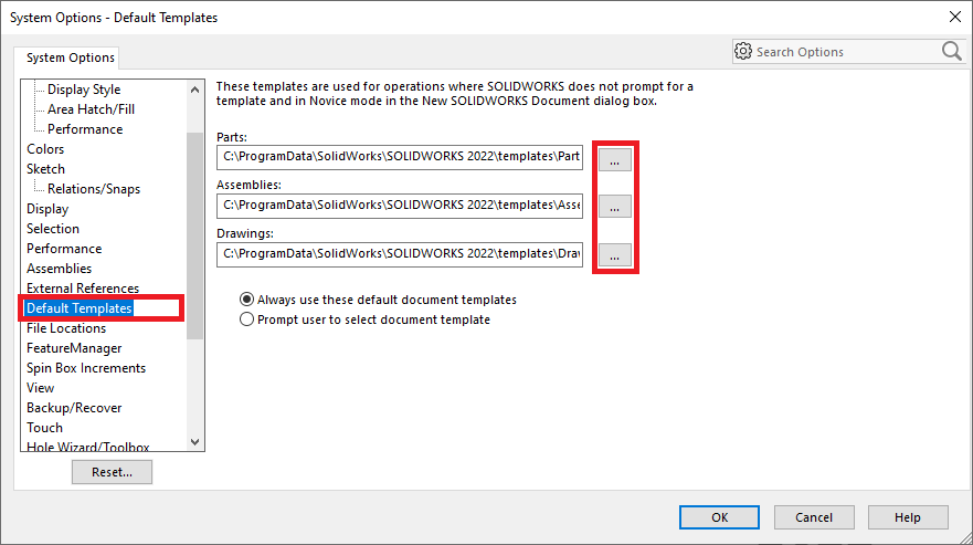 I SOLIDWORKS pekas mallar och underlagsformat ut på två ställen i ”System Options”. Dels i File locations under ”Document Templates” och ”Sheet Formats”. Dels I ”Default Templates” dvs vilka mallar som automatiskt väljs vid till exempel import av STEP-filer.