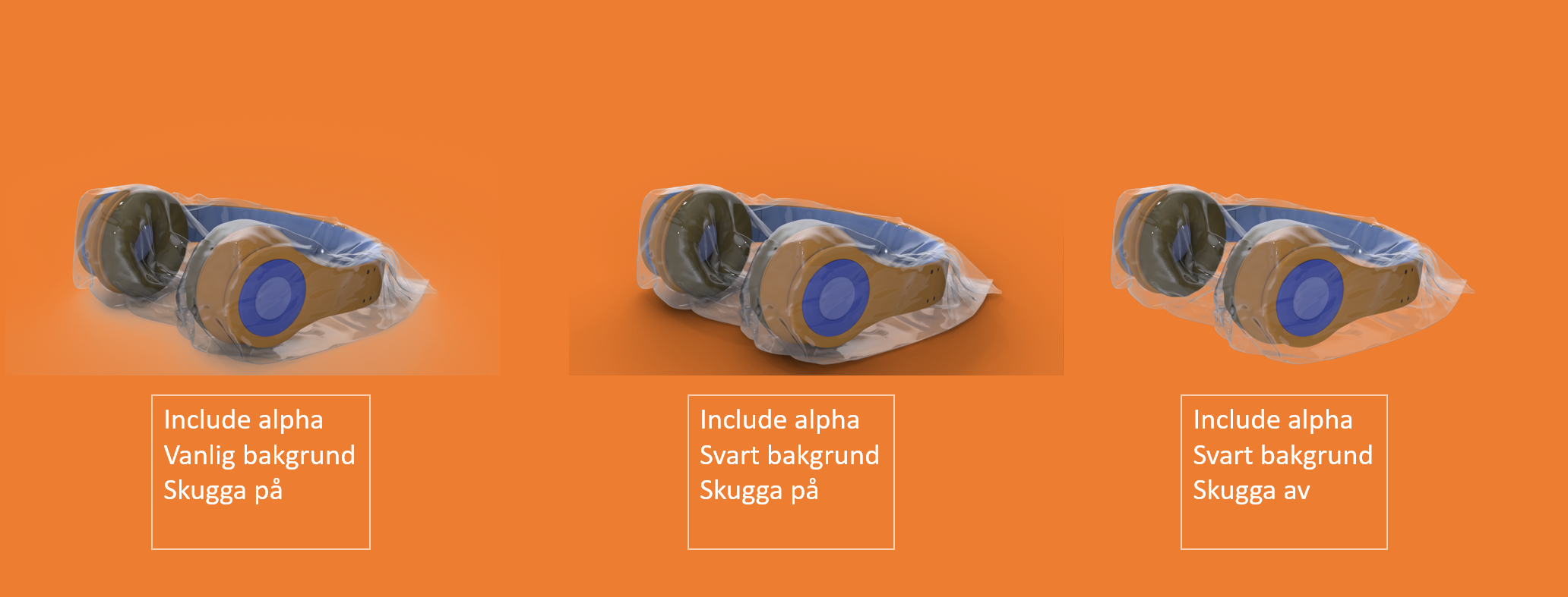 Sammanfattningsvis kan vi titta på tre exempel som visar effekten av de olika inställningar vi gjort. Notera att de alla har en transparent bakgrund men att skuggningarna skiljer sig åt.