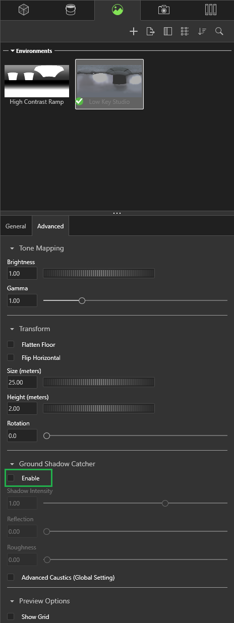 En annan inställning vi kan göra är att stänga av skuggan på marken. Vi hittar inställningen i scen-fliken under Advanced.