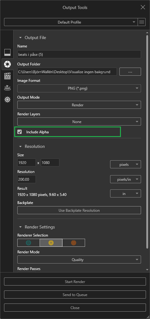 När ett bildformat med stöd för Alpha-kanal har valts återstår bara att bocka i Include Alpha, och våra bilder kommer att sparas med transparent bakgrund.