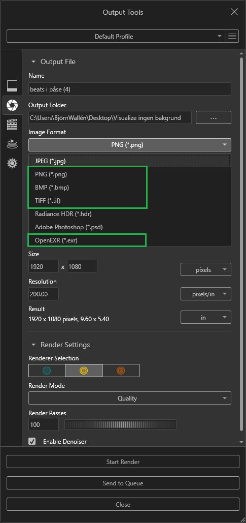 I datorgrafikvärden kallas möjligheten att få transparent bakgrund för Alpha-kanal. Många, men inte alla, bildformat har stöd för dessa. Bland de bidlformat vi kan spara ut från SOLIDWORKS Visualize är det följande som har stöd för Alpha-kanal.