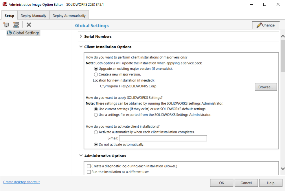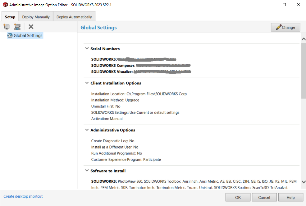 Här kan vi t.ex. ändra serienummer, välja vilka programdelar som ska installeras och annat. Det finns mer om vi skrollar ner i fönstret. När vi är nöjda med ändringarna klickar vi på Change knappen igen för att komma tillbaka till föregående läge.