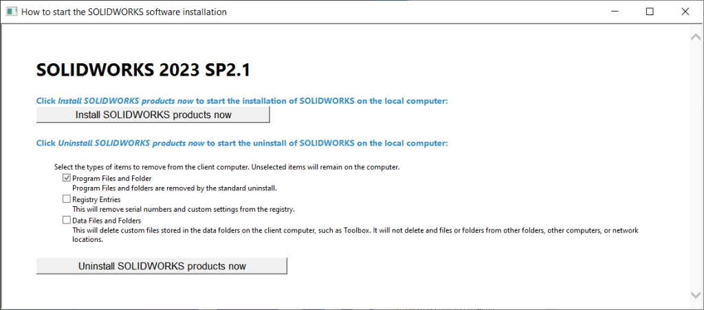 För att starta installationen går man till den utdelade mappen och kör filen StartSWInstall.hta, då öppnas en webbsida där vi klickar på Install SOLIDWORKS product now knappen.